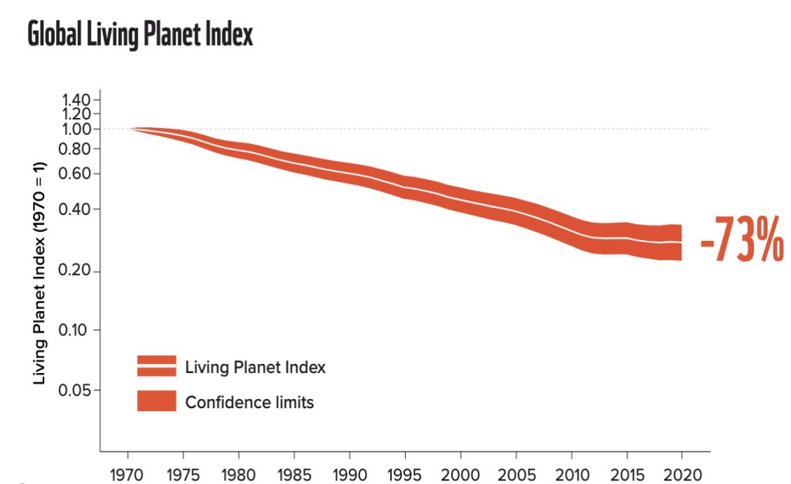 Εικόνα 3: Ο Παγκόσμιος Δείκτης Ζωντανού Πλανήτη (Living Planet Index) για την περίοδο 1970–2020, βασισμένος σε 34.836 παρακολουθούμενους πληθυσμούς από 5.495 είδη σπονδυλωτών. Η λευκή γραμμή αντιπροσωπεύει την τιμή του δείκτη, ενώ οι σκιασμένες περιοχές δείχνουν την στατιστική αβεβαιότητα γύρω από την τιμή (Πηγή: Living Planet Report 2024 της WWF).
