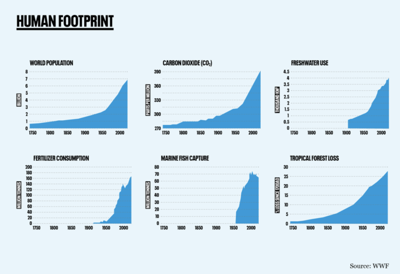 Εικόνα 4: Ενδείξεις της καταλυτικής επίδρασης του ανθρώπου στο πλανήτη μέσω της αύξησης του πληθυσμού (10πλάσιος σε σχέση με 1750), της αύξησης στην ατμόσφαιρα του διοξειδίου του άνθρακα (45% αύξηση σε σχέση με 1750), της υπεραλίευσης (αύξηση πάνω από 6 φορές σε σχέση με 1950), της αύξησης της χρήσης φυτοφαρμάκων (αύξηση πάνω από 16 φορές σε σχέση με το 1950), της αύξησης καταστροφής των τοπικών δασών και της δραματικής αύξησης χρήσης καθαρού νερού (4πλασιασμός σε σχέση με 1900). Τα στοιχεία είναι από την WWF.