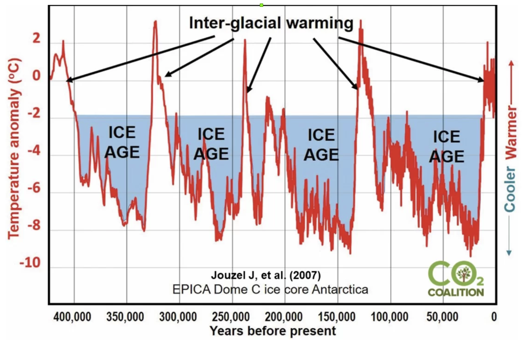 Εικόνα 5: Η εξέλιξη παλαιοκλιματικών θερμοκρασιακών ανωμαλιών (δηλαδή της διαφοράς της παλαιοκλιματικής θερμοκρασίας με την σημερινή μέση θερμοκρασίας αναφοράς) κατά τα τελευταία ~800.000 χρόνια από τα δεδομένα EPICA Dome C στην Ανταρκτική. Οι εκτεταμένες παγετώδεις εποχές, που διαρκούν 50.000-70.000 χρόνια περίπου) παρεμβάλλονται από σύντομες μεσοπαγετώδεις εποχές (που διαρκούν 10.000-20.000 χρόνια περίπου). Ο υπολογισμός των θερμοκρασιών βασίζεται στην ανάλυση του πάγου από πυρήνες που εξάγονται στην Ανταρκτική, και συγκεκριμένα βασίζεται κυρίως στον υπολογισμό του λόγου των σταθερών ισοτόπων του οξυγόνου 18Ο/16Ο σε σχέση με τον αντίστοιχο λόγο αναφοράς καθώς η αναλογία αυτή σχετίζεται με την θερμοκρασία: σε ψυχρότερες συνθήκες ο λόγος είναι μικρότερος και το αντίθετο σε θερμότερες συνθήκες (Πηγή: https://co2coalition.org/).