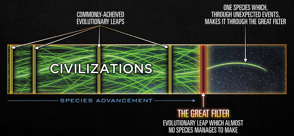 Κι εδώ τίθεται το πιο κρίσιμο ερώτημα: Θα προλάβουμε να αναστρέψουμε τις συνέπειες των ίδιων μας των καταστροφικών «αναπτυξιακών» επιλογών πριν να είναι πολύ αργά; Μήπως αυτές οι επιλογές συνδέονται με πιθανή εξήγηση του Παράδοξου του Fermi, που αφορά στο ερώτημα «Που είναι οι άλλοι;», δηλαδή αφού το Σύμπαν είναι γεμάτο από γαλαξίες με δισεκατομμύρια αστρικών συστημάτων, κάποια από τα οποία θα έχουν παρόμοιες συνθήκες ανάπτυξης ζωής με τη Γη, γιατί δεν έχουμε συναντήσει κανέναν άλλο πολιτισμό; Μια πιθανή απάντηση προέρχεται από την υπόθεση του Μεγάλου Φίλτρου (Hanson, 1998), σύμφωνα με την οποία στην αναμενόμενη φυσική αλληλουχία γεγονότων που οδηγούν σε επέκταση ενός πολιτισμού στο διάστημα, δηλαδή από την ανόργανη ύλη, στην οργανική, στην ανάπτυξη απλών και μετά σύνθετων μορφών ζωής, στην ανάπτυξη ευφυούς ζωής, στην ανάπτυξη πολιτισμού, επιστήμης και τεχνολογίας, και τέλος στην επέκταση στο διάστημα υπάρχει ένα Μεγάλο Φίλτρο, το οποίο διακόπτει την αλληλουχία αυτή (εικόνα 6).