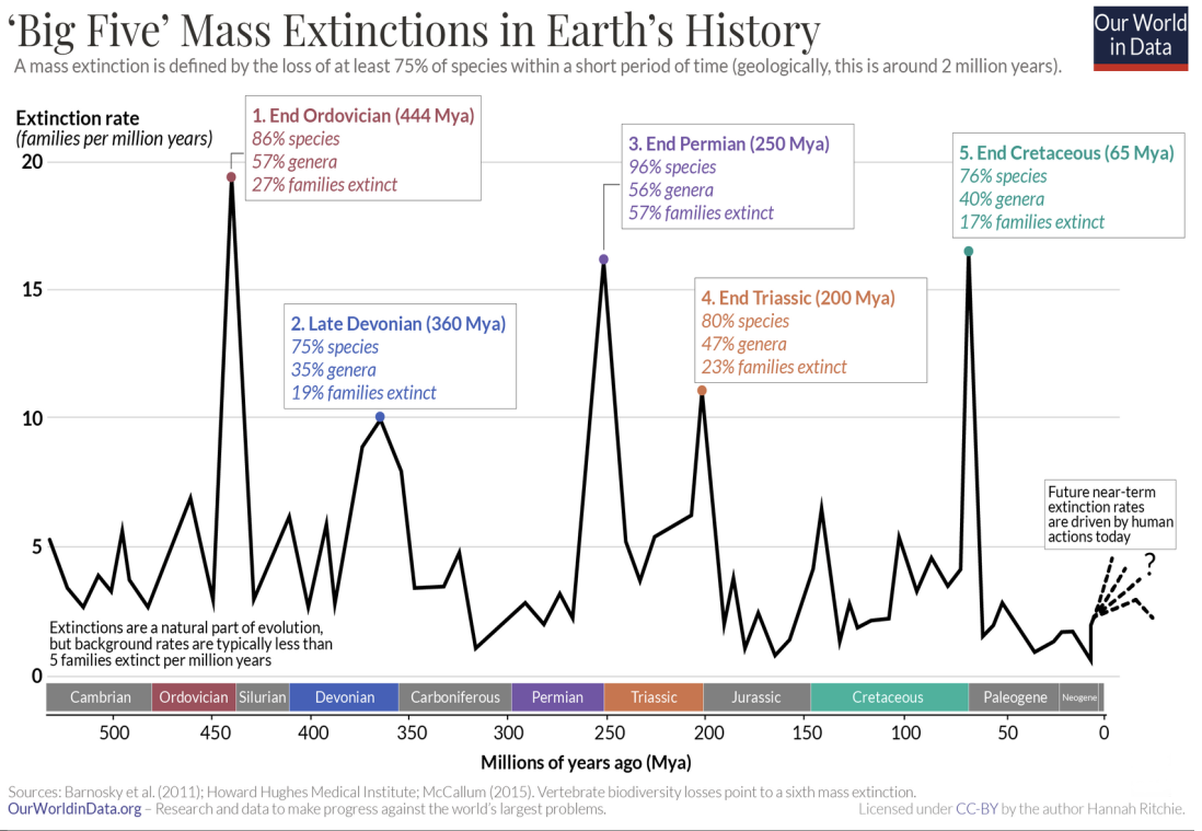Εικόνα 1: Ο ρυθμός εξαφάνισης οικογενειών συναρτήσει του γεωλογικού χρόνου. Τα πέντε μεγάλα γεγονότα ενδεικνύονται χαρακτηριστικά και αναφέρεται για κάθε ένα το ποσοστό των ειδών,γενών και οικογενειών που εξαφανίστηκαν (Πηγή: OurWorldinData.org – H.Ritchie).