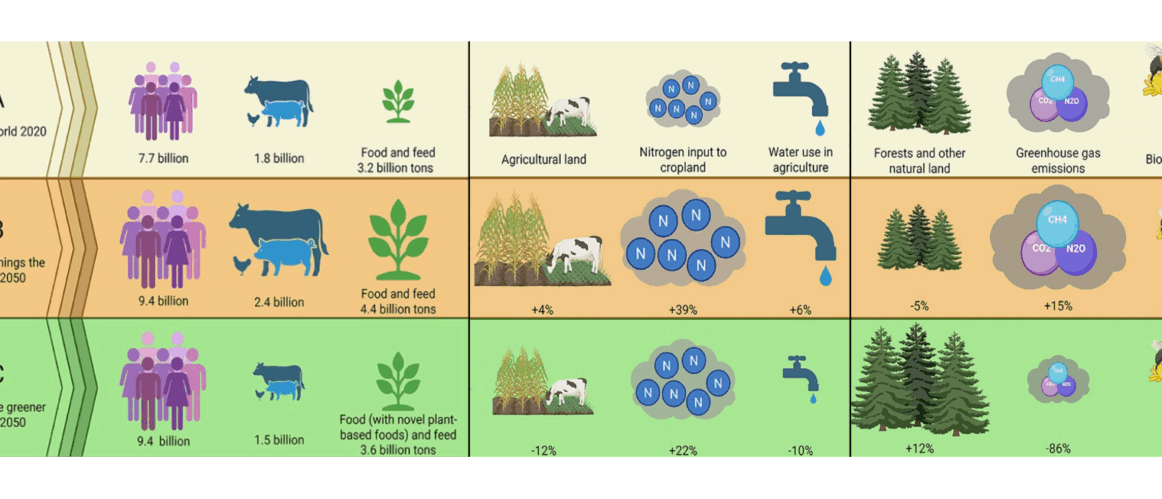 Εικόνα 1: Ο κόσμος τώρα και το 2050 με δύο διατροφικά μοντέλα για τον αυξανόμενο πληθυσμό: (Α) Η τρέχουσα κατάσταση (Β) Το μέλλον εάν δεν αλλάξουμε διατροφικές συνήθειες (C) To μέλλον εάν οι άνθρωποι καταναλώνουν το 50% σε κρέας και γαλακτοκομικά σε σχέση με το (Β). Η εικόνα δείχνει την επίπτωση στο πλήθος των ζώων (Tropical Livestock Units), στην ποσότητα της αγροτικής παραγωγής (στερεό μέρος), στη χρήση Γης για γεωργία και κτηνοτροφία, στη χρήση λιπασμάτων (άζωτο), στη χρήση νερού, στην αποψίλωση δασών, στην εκπομπή θερμοκηπικών αερίων και τη μείωση της βιοποικιλότητας.